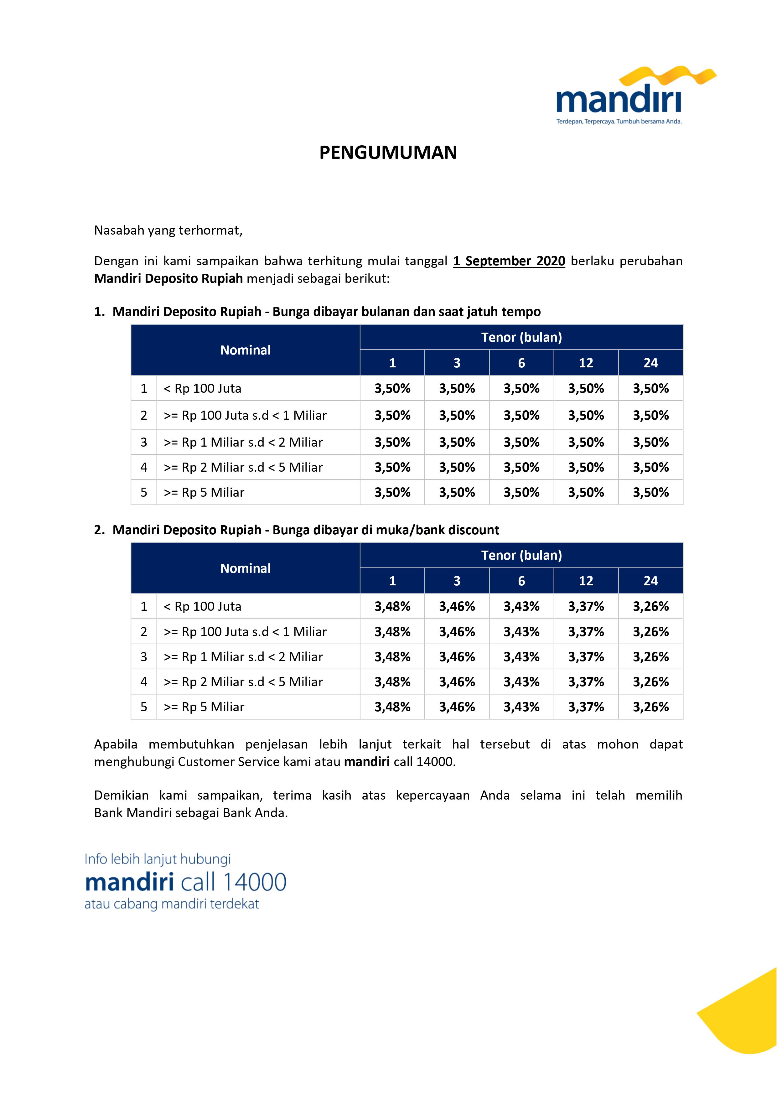 Bunga Deposito Mandiri Dan Bri Senin 2 Agustus 2021 from foto.kontan.co.id Check spelling or type a new query. We did not find results for: Maybe you would like to learn more about one of these?